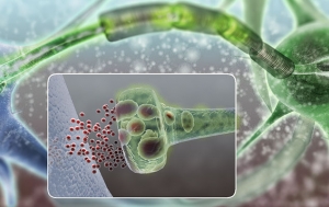 An image of the synaptic junction, the place where a nerve impulse passes from on neuron to the...